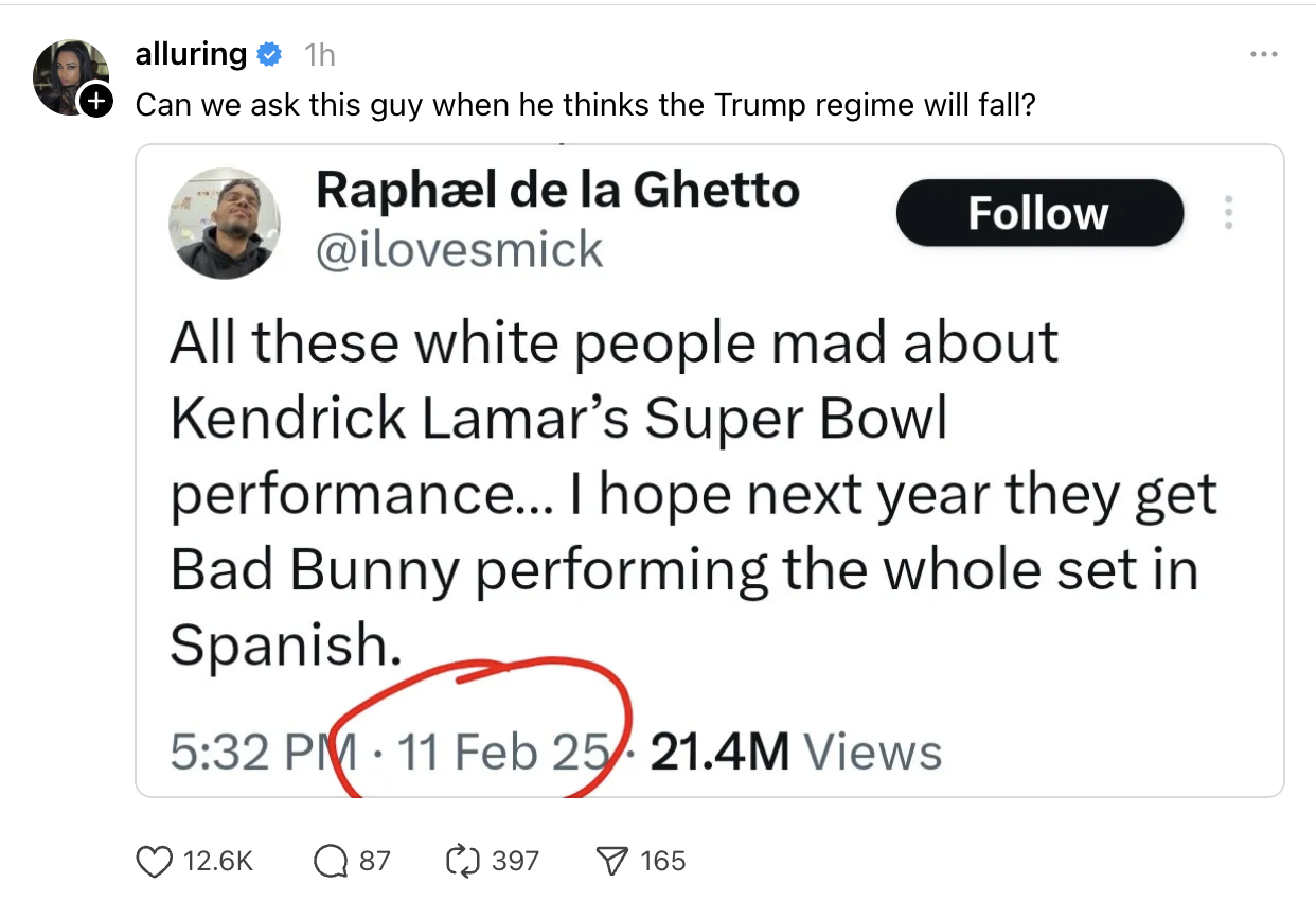 February 9, 2026 Jason Gooljar Get like Kendrick and Bad Bunny to do a collab halftime show next year. Twitter will be on meltdown.