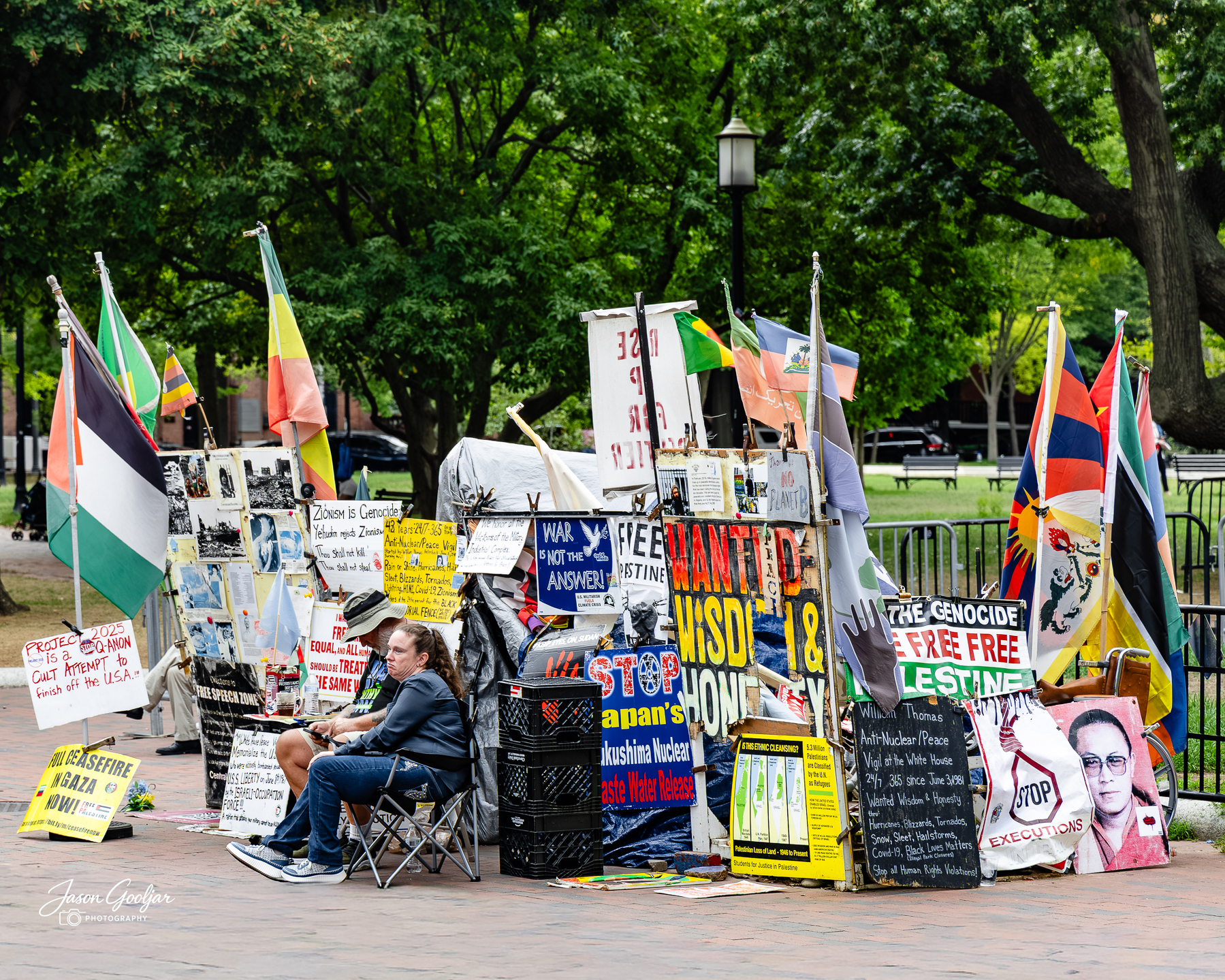 The White House Peace Vigil. Both Republican and Democratic administrations allowed it to stand until 2025, when King Trump first of his name, protector of Qatar, destroyer of the Kennedy Center, holy father, and master of white supremacy had it removed. This picture was taken in 2024.